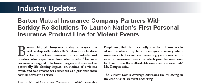 Berkley Re Solutions Partners With Barton Mutual Insurance Company To Launch Nation’s First Personal Insurance Product Line For Violent Events